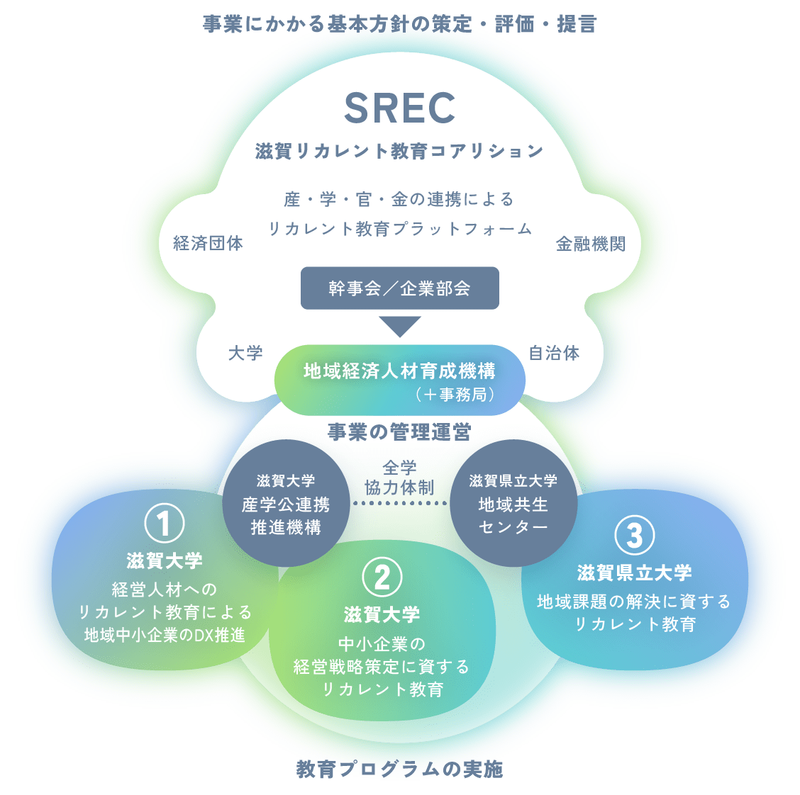滋賀リカレント教育コアリション(Shiga Recurrent Education Coalition)は、滋賀県の産業や文化といった地域的特徴を生かし、企業や地域における多様な人材のリスキリングを支援する産学官金連携の教育プラットフォームです。滋賀大学・滋賀県立大学を中心に、地域の経済団体、金融機関、自治体等と連携・協力し、地域や企業のニーズに応じた実践的な教育プログラムを提供します。また、産学官金の連携を通じて、企業間のネットワーク構築を促進し、新規事業の創出やスタートアップの立ち上げにも寄与し、地域経済の活性化に貢献します。