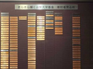 令和2年4月1日以降、滋賀大学基金への直近3年間のご寄附累計額が30万円に達した個人・法人様は、ご寄附の際の意思確認を基に、顕彰プレートを作成し、滋賀大学講堂の「きらきら輝く滋賀大学基金 寄附者芳名板」にて末永く顕彰させていただくとともに、感謝の集いにご招待させていただきます。