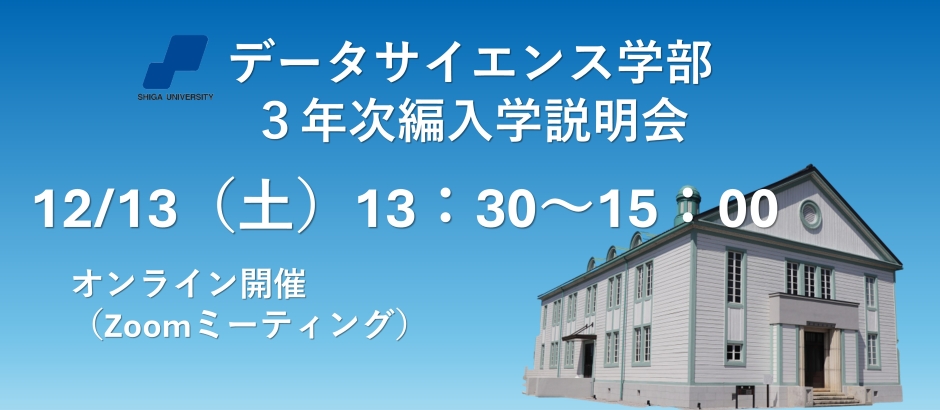 データサイエンス学部3年次編入学説明会を開催します。 詳細はこちら 滋賀大学の学びの魅力が詰まった特設サイト。さまざまな動画コンテンツを通じて、滋賀大学を深く理解することができます。 詳細はこちら 入試カレンダーや入試内容、出願方法、学費についてなど、入試に関わる情報を集約したインデックスページです。 詳細はこちら 滋賀大学の大学案内のデジタルパンフレットや、学生募集要項などの入試関連の資料のPDFが閲覧できます。 詳細はこちら 18名の先生の講義を動画で公開しています。 詳細はこちら 入試関連のお知らせ 教育 経済 データサイエンス 一覧を見る 入試関連リンク 入試カレンダー 出願方法・出願資格 過去の入試統計 メールマガジン 大学入試センター 入学を決めた理由 学部・大学院・専攻科 データサイエンス学部 教育内容について 3つのポリシー 経済学部 教育内容について 3つのポリシー 教育学部 教育内容について 3つのポリシー 大学院 データサイエンス研究科 教育内容について 3つのポリシー 大学院 経済学研究科 教育内容について 3つのポリシー 大学院 教育学研究科 教育内容について 3つのポリシー 特別支援教育専攻科 兵庫教育大学大学院 連合学校教育学研究科 学生生活 資格・免許 進路の実績 海外派遣 クラブ・サークル ボランティア 学生寮・住居 キャンパス キャンパス紹介 キャンパスマップ 彦根キャンパス 交通アクセス 大津キャンパス 交通アクセス 彦根エリア紹介 彦根マップ 大津エリア紹介 大津マップ 大学案内・学生募集要項 資料請求(有料)