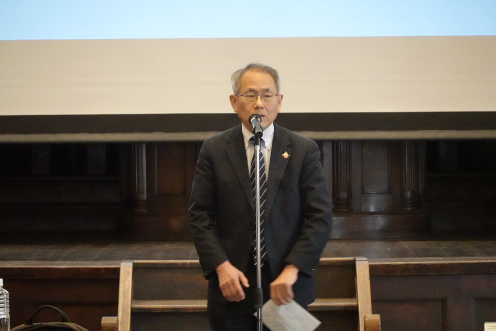 会場には約40名の関係者にお集まりいただき、最初に学長の竹村より主催者を代表して挨拶がありました。